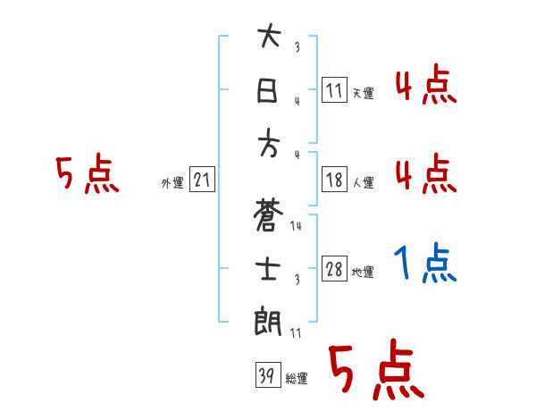 総運![]() | 大日方蒼士朗さんの総運は39画の5つ星!社交性に優れ人望が厚い。人の上に立ち成功する。 あなたの人生を表す1番重要な運勢です。生涯を通じて影響する総合運となり、主に50歳以降の晩年期に影響を及ぼします。 |