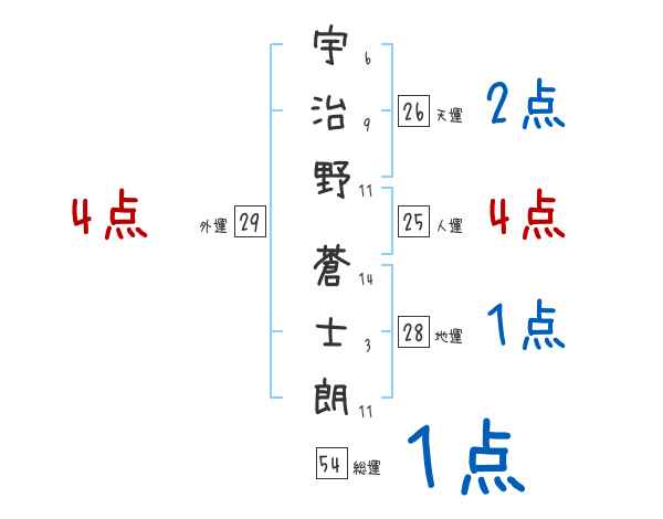 総運![]() | 宇治野蒼士朗さんの総運は54画の1つ星!トラブルが多いかも。周りをよく見て協調して過ごしましょう。 あなたの人生を表す1番重要な運勢です。生涯を通じて影響する総合運となり、主に50歳以降の晩年期に影響を及ぼします。 |