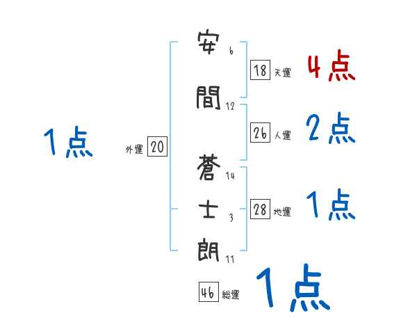| 天運  | 安間蒼士朗さんの天運は18画の4つ星!情熱的で剛気。忍耐力があり信頼される。家系が持つ宿命的な運勢を表します。祖先から受け継いだ苗字ですので自分の力が及びません。家柄を象徴します。 |