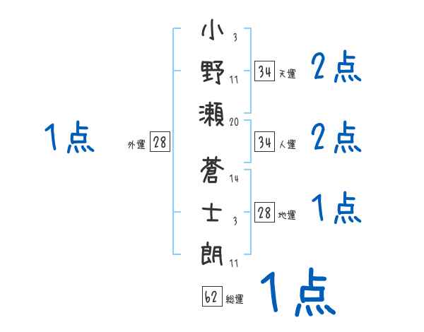 地運![]() | 小野瀬蒼士朗さんの地運は28画の1つ星!家庭環境に注意。スポーツで活躍できる能力があるかも。 個性を表す基礎的な運勢です。性格形成や対人関係、行動力など家庭環境に影響されます。主に誕生してから20歳くらいまでの若年期の運勢を表します。 |