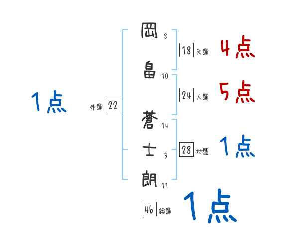 総運![]() | 岡畠蒼士朗さんの総運は46画の1つ星!迷走することが多く苦労するかも。目先のことにとらわれないように。 あなたの人生を表す1番重要な運勢です。生涯を通じて影響する総合運となり、主に50歳以降の晩年期に影響を及ぼします。 |