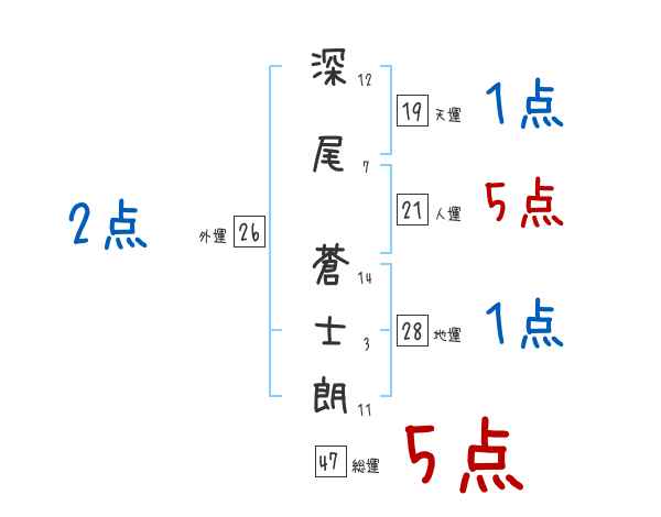 人運![]() | 深尾蒼士朗さんの人運は21画の5つ星!統率力がある。独立し成功する。名誉を手に入れる。 性格や才能などを表す2番目に重要な運勢です。人間関係や協調性、社会的な成功に影響します。主に20歳から50歳ぐらいまでの中年期の運勢を表します。 |