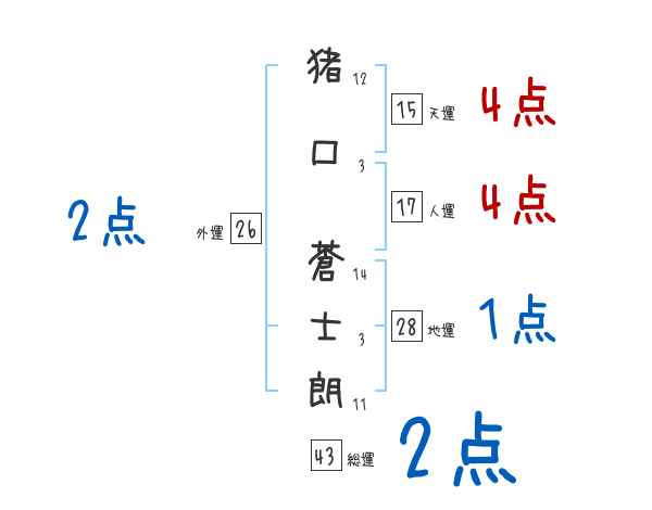 地運![]() | 猪口蒼士朗さんの地運は28画の1つ星!家庭環境に注意。スポーツで活躍できる能力があるかも。 個性を表す基礎的な運勢です。性格形成や対人関係、行動力など家庭環境に影響されます。主に誕生してから20歳くらいまでの若年期の運勢を表します。 |