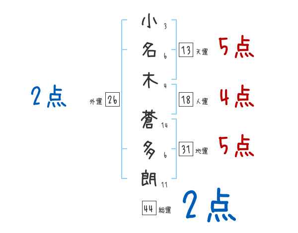 地運![]() | 小名木蒼多朗さんの地運は31画の5つ星!社交性があり判断力に優れる。順風満帆な人生で円満な生活。 個性を表す基礎的な運勢です。性格形成や対人関係、行動力など家庭環境に影響されます。主に誕生してから20歳くらいまでの若年期の運勢を表します。 |