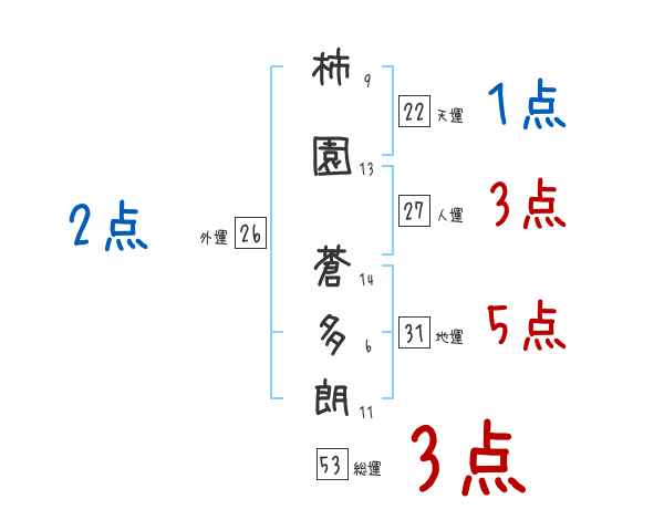 総運![]() | 柿園蒼多朗さんの総運は53画の3つ星!やや見栄っ張りで虚栄心がある。散財に注意。 あなたの人生を表す1番重要な運勢です。生涯を通じて影響する総合運となり、主に50歳以降の晩年期に影響を及ぼします。 |