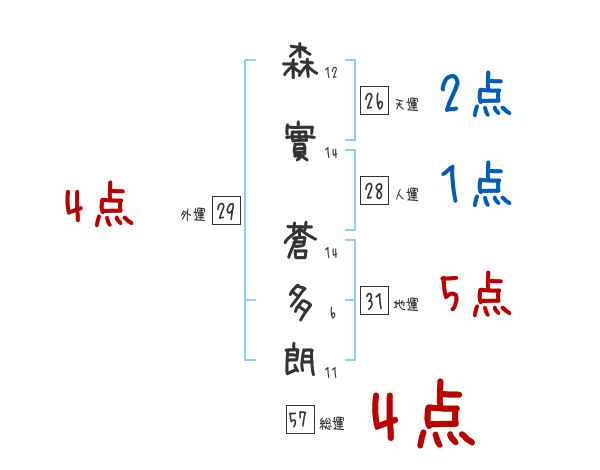 総運![]() | 森實蒼多朗さんの総運は57画の4つ星!向上心があり人望がある。地位を得る。 あなたの人生を表す1番重要な運勢です。生涯を通じて影響する総合運となり、主に50歳以降の晩年期に影響を及ぼします。 |
