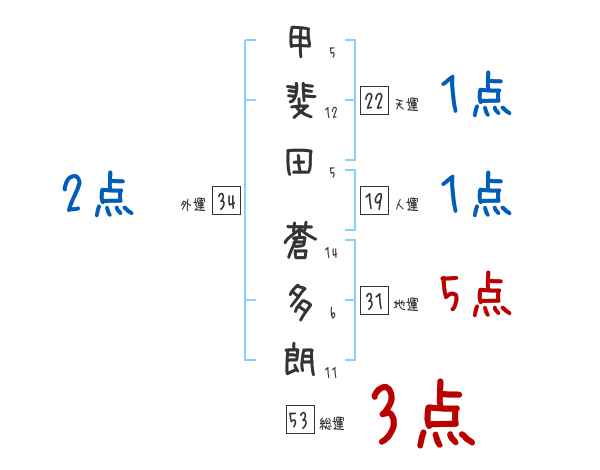 総運![]() | 甲斐田蒼多朗さんの総運は53画の3つ星!やや見栄っ張りで虚栄心がある。散財に注意。 あなたの人生を表す1番重要な運勢です。生涯を通じて影響する総合運となり、主に50歳以降の晩年期に影響を及ぼします。 |