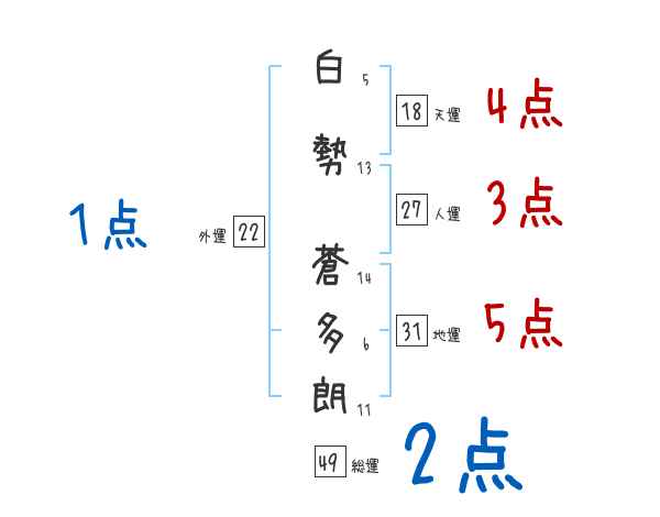 外運![]() | 白勢蒼多朗さんの外運は22画の1つ星!努力することが苦手ないっぽう手先が器用。芸術性にも優れる。 生活面を象徴する運勢です。外部から受ける影響力を表し、結婚運、家庭運や職場、環境への順応性を表します。 |