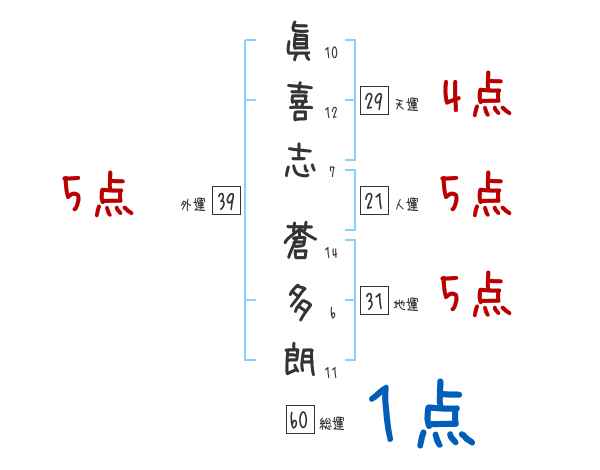 人運![]() | 眞喜志蒼多朗さんの人運は21画の5つ星!統率力がある。独立し成功する。名誉を手に入れる。 性格や才能などを表す2番目に重要な運勢です。人間関係や協調性、社会的な成功に影響します。主に20歳から50歳ぐらいまでの中年期の運勢を表します。 |