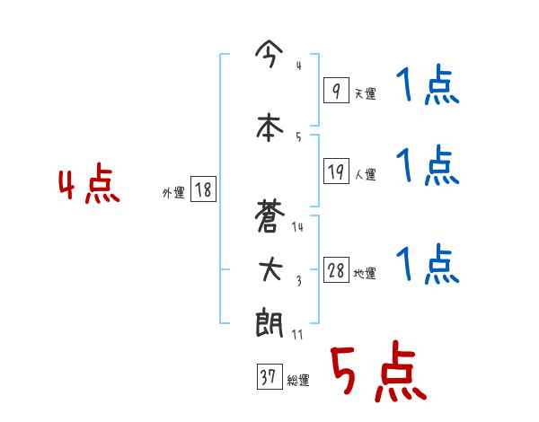 天運![]() | 今本蒼大朗さんの天運は9画の1つ星!消極的で才能を発揮することが苦手なことも。周りの意見に耳を傾けましょう。 家系が持つ宿命的な運勢を表します。祖先から受け継いだ苗字ですので自分の力が及びません。家柄を象徴します。 |