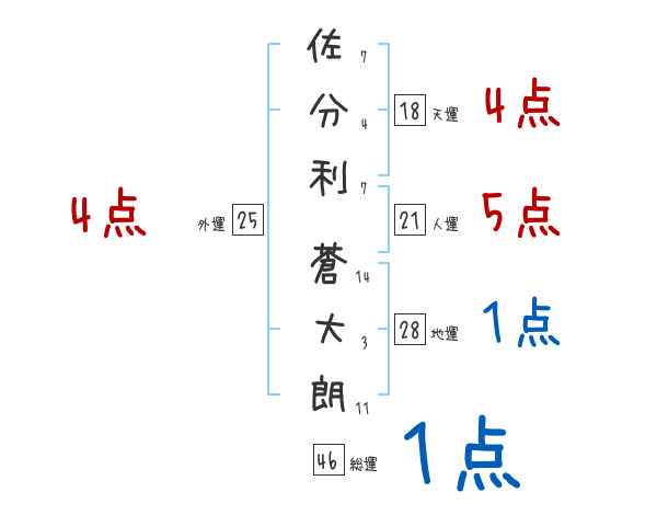 天運![]() | 佐分利蒼大朗さんの天運は18画の4つ星!情熱的で剛気。忍耐力があり信頼される。 家系が持つ宿命的な運勢を表します。祖先から受け継いだ苗字ですので自分の力が及びません。家柄を象徴します。 |