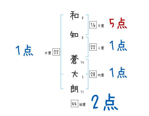 総運![]() | 和知蒼大朗さんの総運は44画の2つ星!誠実で慎重な性格。物事を考えすぎないように注意しましょう。 あなたの人生を表す1番重要な運勢です。生涯を通じて影響する総合運となり、主に50歳以降の晩年期に影響を及ぼします。 |