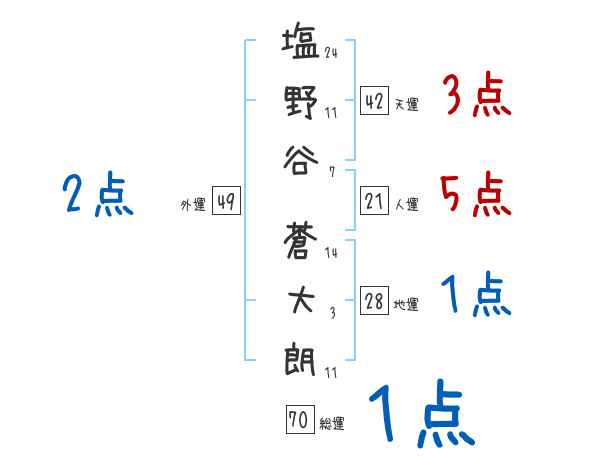 人運![]() | 塩野谷蒼大朗さんの人運は21画の5つ星!統率力がある。独立し成功する。名誉を手に入れる。 性格や才能などを表す2番目に重要な運勢です。人間関係や協調性、社会的な成功に影響します。主に20歳から50歳ぐらいまでの中年期の運勢を表します。 |