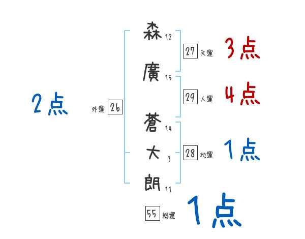 天運![]() | 森廣蒼大朗さんの天運は27画の3つ星!頭脳明晰だが強情で摩擦が多い傾向。孤立に注意。 家系が持つ宿命的な運勢を表します。祖先から受け継いだ苗字ですので自分の力が及びません。家柄を象徴します。 |