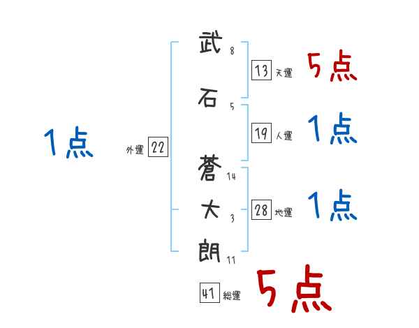 総運![]() | 武石蒼大朗さんの総運は41画の5つ星!大志を抱き、目標に向かって実力を発揮し達成する。温和な性格。 あなたの人生を表す1番重要な運勢です。生涯を通じて影響する総合運となり、主に50歳以降の晩年期に影響を及ぼします。 |
