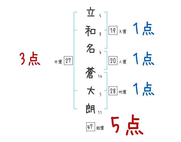 天運![]() | 立和名蒼大朗さんの天運は19画の1つ星!優れた才能を持ちますが、協調性が足りないことも。周りの人と協力する事を意識しましょう。 家系が持つ宿命的な運勢を表します。祖先から受け継いだ苗字ですので自分の力が及びません。家柄を象徴します。 |