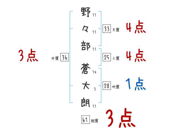 天運![]() | 野々部蒼大朗さんの天運は33画の4つ星!権力志向でプライドが高い。勇気があり運を切り開き成功する。 家系が持つ宿命的な運勢を表します。祖先から受け継いだ苗字ですので自分の力が及びません。家柄を象徴します。 |