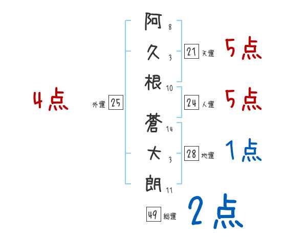 総運![]() | 阿久根蒼大朗さんの総運は49画の2つ星!不安定な性格で明暗がある人生。周りの人には支援されやすい。 あなたの人生を表す1番重要な運勢です。生涯を通じて影響する総合運となり、主に50歳以降の晩年期に影響を及ぼします。 |