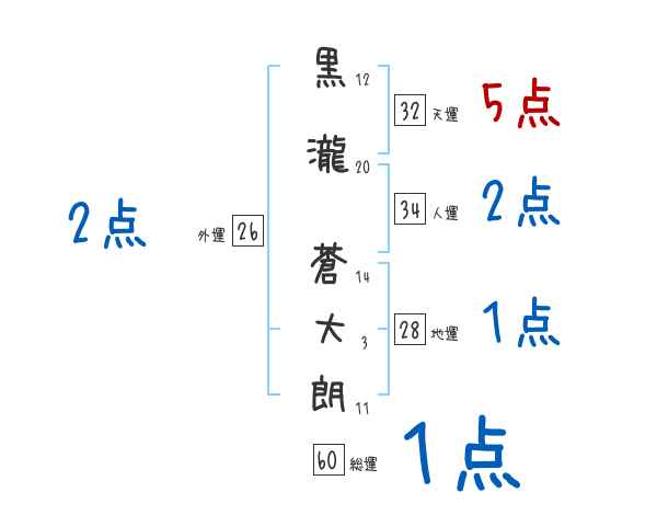 天運![]() | 黒瀧蒼大朗さんの天運は32画の5つ星!柔軟性があり成功する。チャンスが多く金運が良い。 家系が持つ宿命的な運勢を表します。祖先から受け継いだ苗字ですので自分の力が及びません。家柄を象徴します。 |