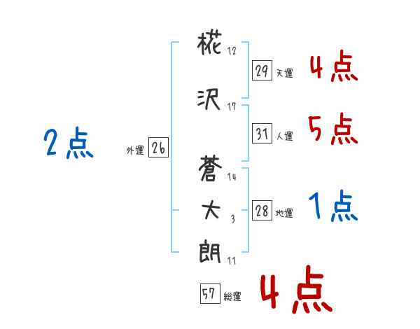 天運![]() | 椛沢蒼大朗さんの天運は29画の4つ星!完全主義で才能がある。厳格な心の持ち主。 家系が持つ宿命的な運勢を表します。祖先から受け継いだ苗字ですので自分の力が及びません。家柄を象徴します。 |