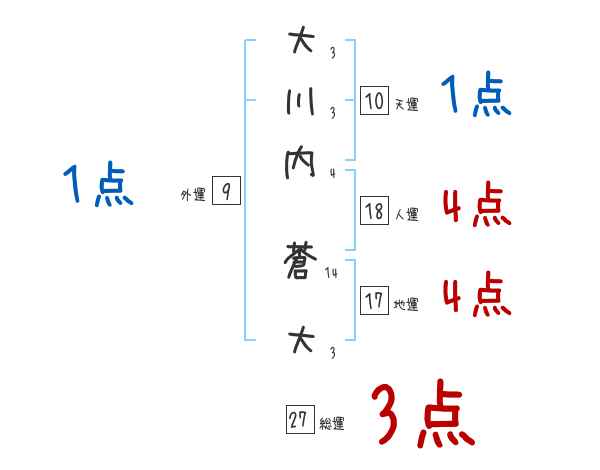 総運![]() | 大川内蒼大さんの総運は27画の3つ星!頭脳明晰だが強情で摩擦が多い傾向。孤立に注意。 あなたの人生を表す1番重要な運勢です。生涯を通じて影響する総合運となり、主に50歳以降の晩年期に影響を及ぼします。 |