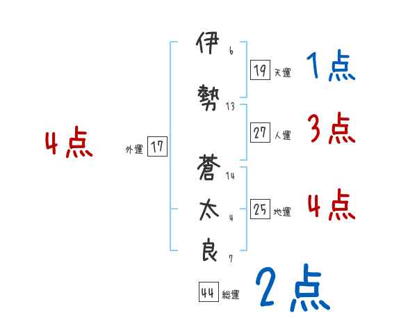 外運![]() | 伊勢蒼太良さんの外運は17画の4つ星!積極的な行動力。地位を気づき財産を手に入れる。純粋な心と直感力。 生活面を象徴する運勢です。外部から受ける影響力を表し、結婚運、家庭運や職場、環境への順応性を表します。 |