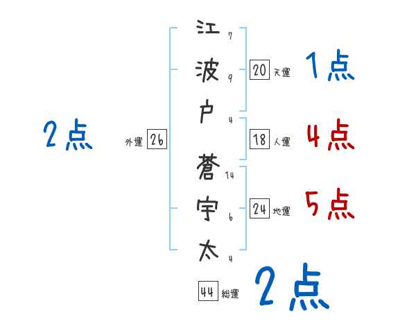 外運![]() | 江波戸蒼宇太さんの外運は26画の2つ星!波瀾万丈かも。信頼できる人を大事にしましょう。 生活面を象徴する運勢です。外部から受ける影響力を表し、結婚運、家庭運や職場、環境への順応性を表します。 |