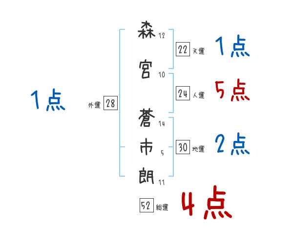 外運![]() | 森宮蒼市朗さんの外運は28画の1つ星!家庭環境に注意。スポーツで活躍できる能力があるかも。 生活面を象徴する運勢です。外部から受ける影響力を表し、結婚運、家庭運や職場、環境への順応性を表します。 |