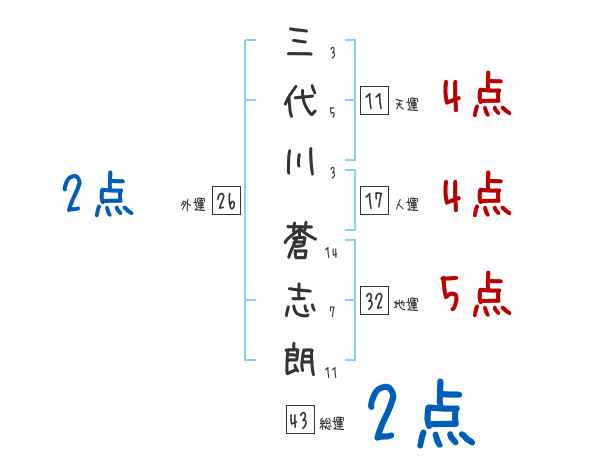 総運![]() | 三代川蒼志朗さんの総運は43画の2つ星!頑固な性格で独立心が強いかも。やや非現実的で浪費に注意しましょう。 あなたの人生を表す1番重要な運勢です。生涯を通じて影響する総合運となり、主に50歳以降の晩年期に影響を及ぼします。 |