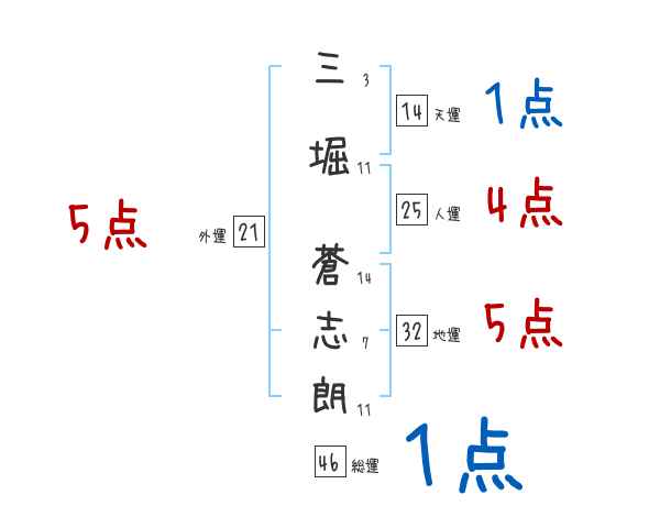 外運![]() | 三堀蒼志朗さんの外運は21画の5つ星!統率力がある。独立し成功する。名誉を手に入れる。 生活面を象徴する運勢です。外部から受ける影響力を表し、結婚運、家庭運や職場、環境への順応性を表します。 |
