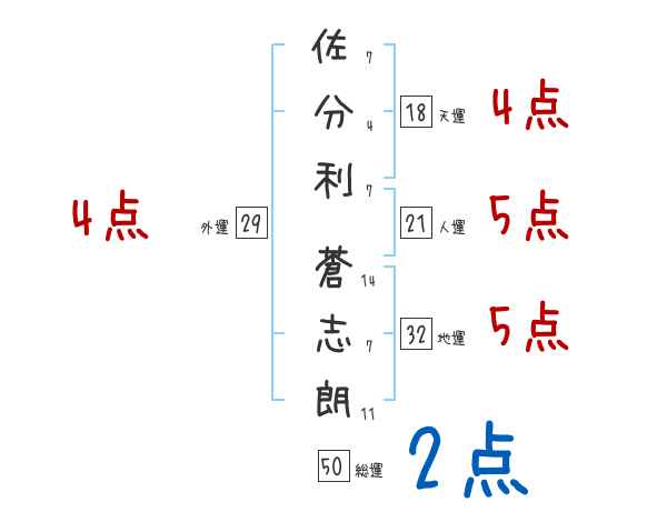 天運![]() | 佐分利蒼志朗さんの天運は18画の4つ星!情熱的で剛気。忍耐力があり信頼される。 家系が持つ宿命的な運勢を表します。祖先から受け継いだ苗字ですので自分の力が及びません。家柄を象徴します。 |