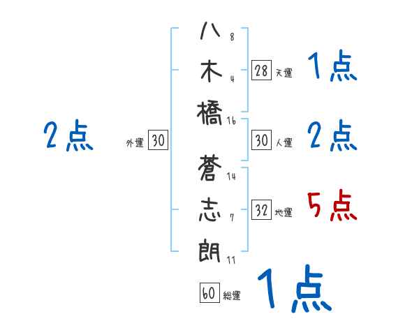 天運![]() | 八木橋蒼志朗さんの天運は28画の1つ星!家庭環境に注意。スポーツで活躍できる能力があるかも。 家系が持つ宿命的な運勢を表します。祖先から受け継いだ苗字ですので自分の力が及びません。家柄を象徴します。 |