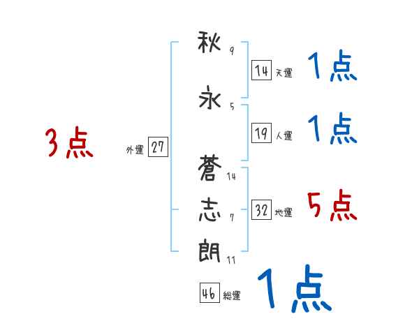 地運![]() | 秋永蒼志朗さんの地運は32画の5つ星!柔軟性があり成功する。チャンスが多く金運が良い。 個性を表す基礎的な運勢です。性格形成や対人関係、行動力など家庭環境に影響されます。主に誕生してから20歳くらいまでの若年期の運勢を表します。 |
