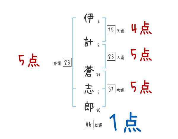 外運![]() | 伊計蒼志郎さんの外運は23画の5つ星!想像力に優れ活力がある。一代で成功し名誉を手に入れる。 生活面を象徴する運勢です。外部から受ける影響力を表し、結婚運、家庭運や職場、環境への順応性を表します。 |