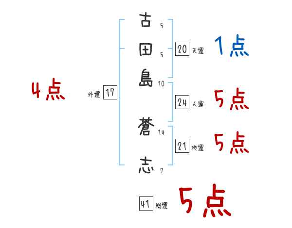 外運![]() | 古田島蒼志さんの外運は17画の4つ星!積極的な行動力。地位を気づき財産を手に入れる。純粋な心と直感力。 生活面を象徴する運勢です。外部から受ける影響力を表し、結婚運、家庭運や職場、環境への順応性を表します。 |
