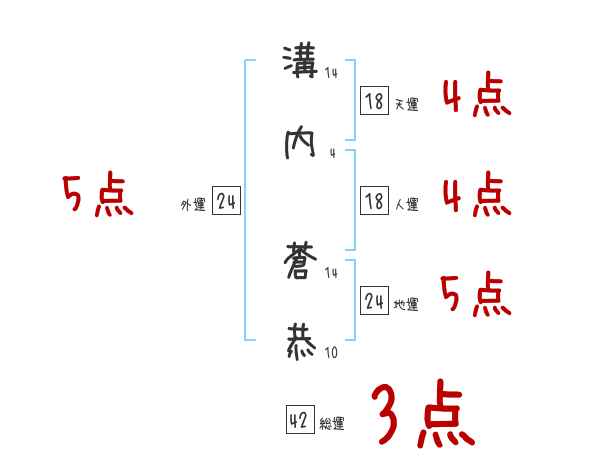 外運![]() | 溝内蒼恭さんの外運は24画の5つ星!家庭運が良く順調な人生。金運にも恵まれる。 生活面を象徴する運勢です。外部から受ける影響力を表し、結婚運、家庭運や職場、環境への順応性を表します。 |