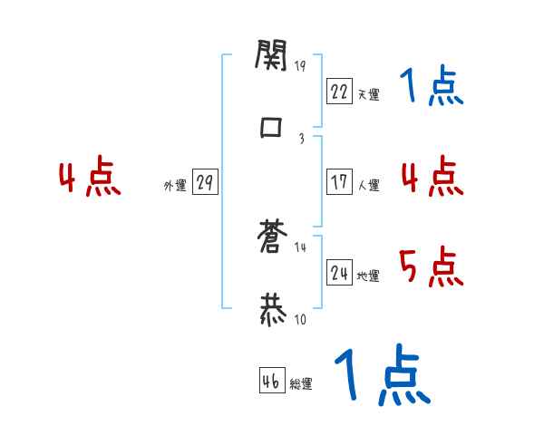 外運![]() | 関口蒼恭さんの外運は29画の4つ星!完全主義で才能がある。厳格な心の持ち主。 生活面を象徴する運勢です。外部から受ける影響力を表し、結婚運、家庭運や職場、環境への順応性を表します。 |
