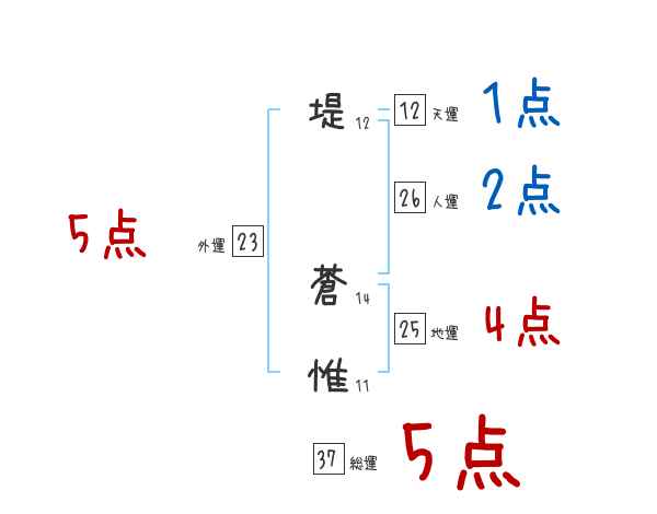 天運![]() | 堤蒼惟さんの天運は12画の1つ星!簡単な失敗で諦めてしまいやすいかも。着実に行動すると良いでしょう。 家系が持つ宿命的な運勢を表します。祖先から受け継いだ苗字ですので自分の力が及びません。家柄を象徴します。 |