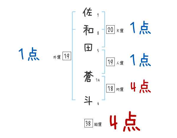 外運![]() | 佐和田蒼斗さんの外運は19画の1つ星!優れた才能を持ちますが、協調性が足りないことも。周りの人と協力する事を意識しましょう。 生活面を象徴する運勢です。外部から受ける影響力を表し、結婚運、家庭運や職場、環境への順応性を表します。 |
