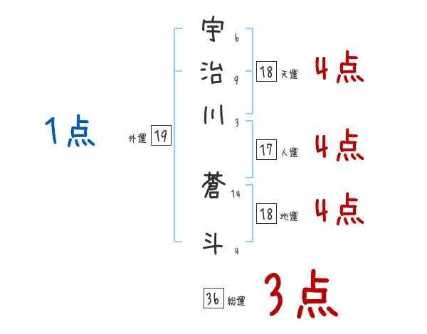 総運![]() | 宇治川蒼斗さんの総運は36画の3つ星!先見性が豊かです。多少神経質で苦労することも。 あなたの人生を表す1番重要な運勢です。生涯を通じて影響する総合運となり、主に50歳以降の晩年期に影響を及ぼします。 |