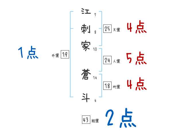 天運![]() | 江刺家蒼斗さんの天運は25画の4つ星!個性があり才能があふれる。強運の持ち主で発展する。 家系が持つ宿命的な運勢を表します。祖先から受け継いだ苗字ですので自分の力が及びません。家柄を象徴します。 |