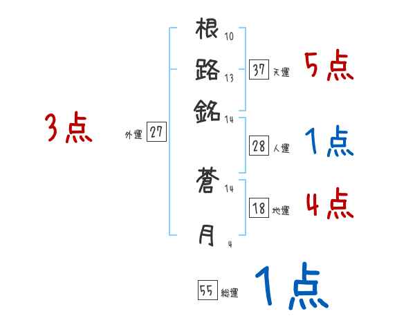 総運![]() | 根路銘蒼月さんの総運は55画の1つ星!欲張りな性格で軽率な行動に注意しましょう。病気に気をつけて。 あなたの人生を表す1番重要な運勢です。生涯を通じて影響する総合運となり、主に50歳以降の晩年期に影響を及ぼします。 |