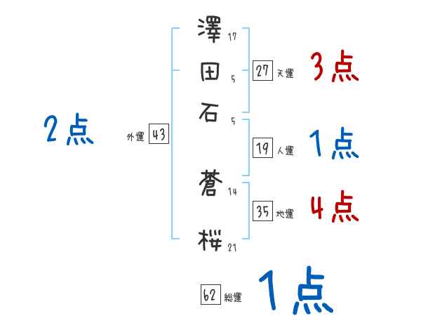 天運![]() | 澤田石蒼桜さんの天運は27画の3つ星!頭脳明晰だが強情で摩擦が多い傾向。孤立に注意。 家系が持つ宿命的な運勢を表します。祖先から受け継いだ苗字ですので自分の力が及びません。家柄を象徴します。 |