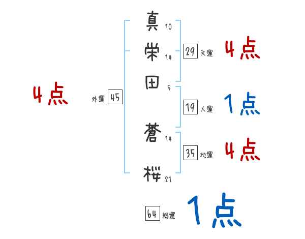 天運![]() | 真栄田蒼桜さんの天運は29画の4つ星!完全主義で才能がある。厳格な心の持ち主。 家系が持つ宿命的な運勢を表します。祖先から受け継いだ苗字ですので自分の力が及びません。家柄を象徴します。 |
