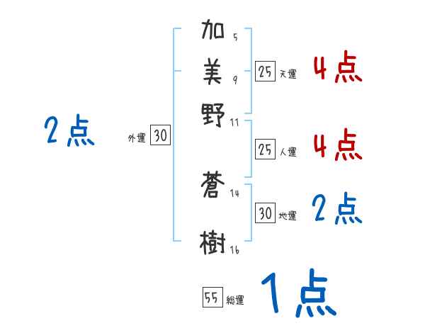 天運![]() | 加美野蒼樹さんの天運は25画の4つ星!個性があり才能があふれる。強運の持ち主で発展する。 家系が持つ宿命的な運勢を表します。祖先から受け継いだ苗字ですので自分の力が及びません。家柄を象徴します。 |