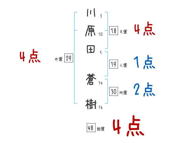 総運![]() | 川原田蒼樹さんの総運は48画の4つ星!賢明な性格で人望が厚い。指導力があり多くの人に尊敬される。 あなたの人生を表す1番重要な運勢です。生涯を通じて影響する総合運となり、主に50歳以降の晩年期に影響を及ぼします。 |