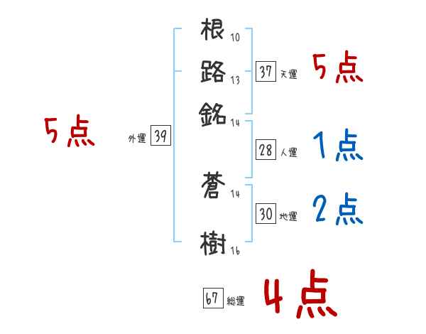 外運![]() | 根路銘蒼樹さんの外運は39画の5つ星!社交性に優れ人望が厚い。人の上に立ち成功する。 生活面を象徴する運勢です。外部から受ける影響力を表し、結婚運、家庭運や職場、環境への順応性を表します。 |