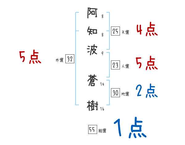 外運![]() | 阿知波蒼樹さんの外運は32画の5つ星!柔軟性があり成功する。チャンスが多く金運が良い。 生活面を象徴する運勢です。外部から受ける影響力を表し、結婚運、家庭運や職場、環境への順応性を表します。 |