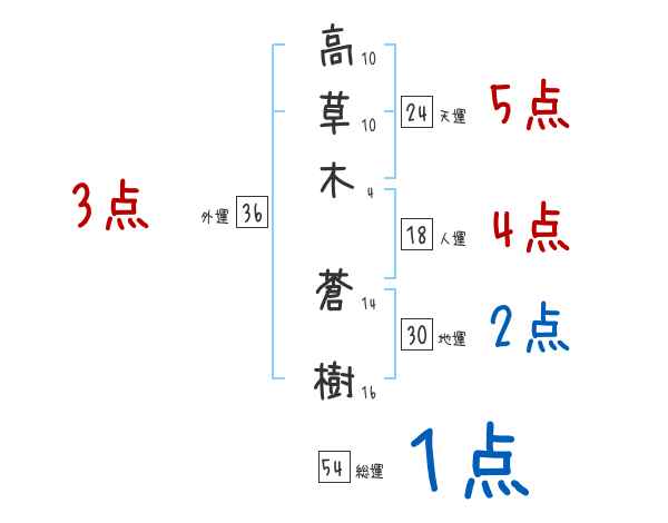 天運![]() | 高草木蒼樹さんの天運は24画の5つ星!家庭運が良く順調な人生。金運にも恵まれる。 家系が持つ宿命的な運勢を表します。祖先から受け継いだ苗字ですので自分の力が及びません。家柄を象徴します。 |