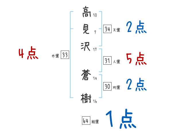 外運![]() | 高見沢蒼樹さんの外運は33画の4つ星!権力志向でプライドが高い。勇気があり運を切り開き成功する。 生活面を象徴する運勢です。外部から受ける影響力を表し、結婚運、家庭運や職場、環境への順応性を表します。 |